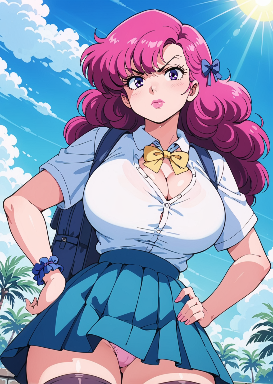 Trigger words: 1girl, solo, pink hair, pink eyes, curly hair, yellow dress, blue apron