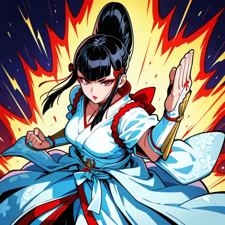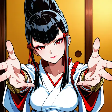 KazumiMishima, 1girl, solo, mature female, medium breasts, red eyes, makeup, red eyeshadow, black hair, blunt bangs, sidelocks, hair ornament, hair bun, white kimono, japanese clothes, arm guards, tabi
