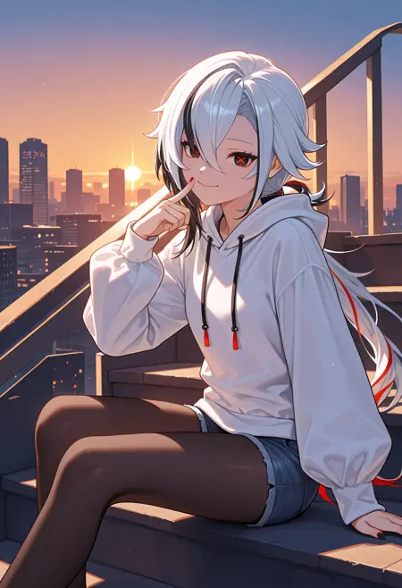 外观: 长发,挑染发,白发,黑发,头发遮住眼睛,低马尾,黑眼睛,红色瞳孔,X形瞳孔