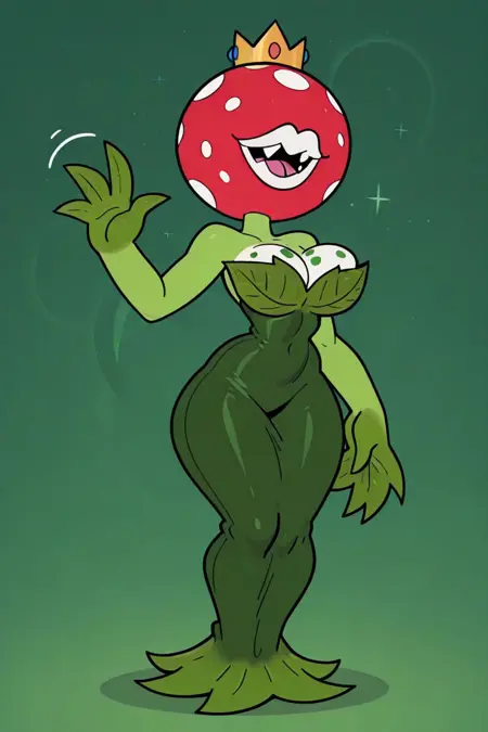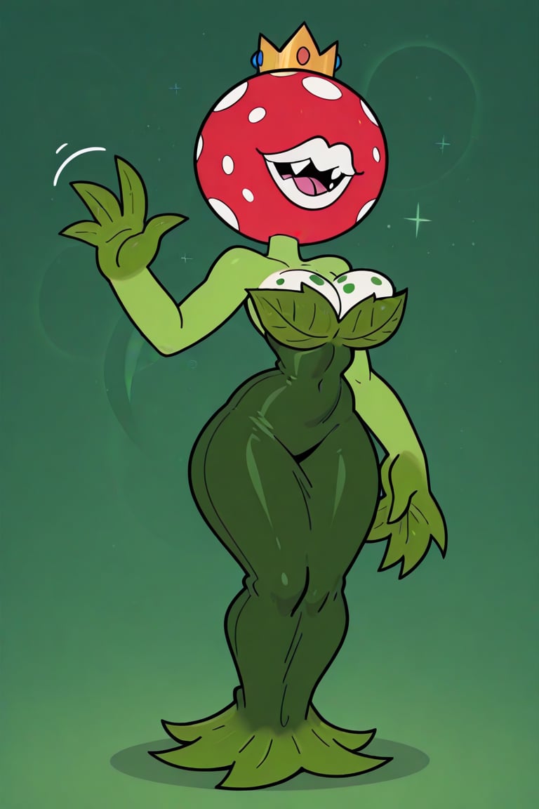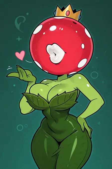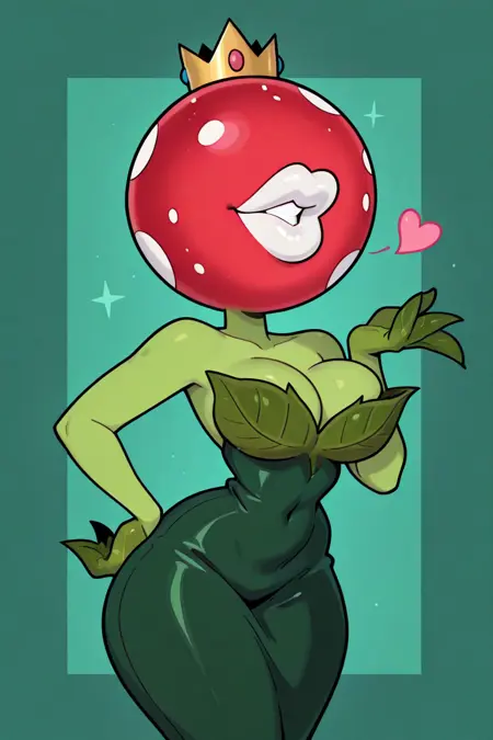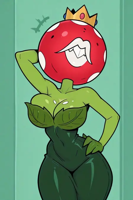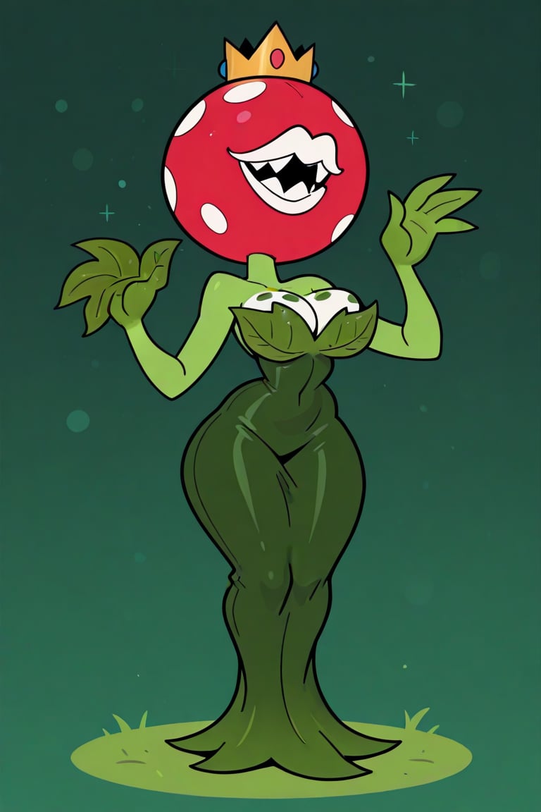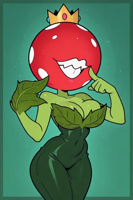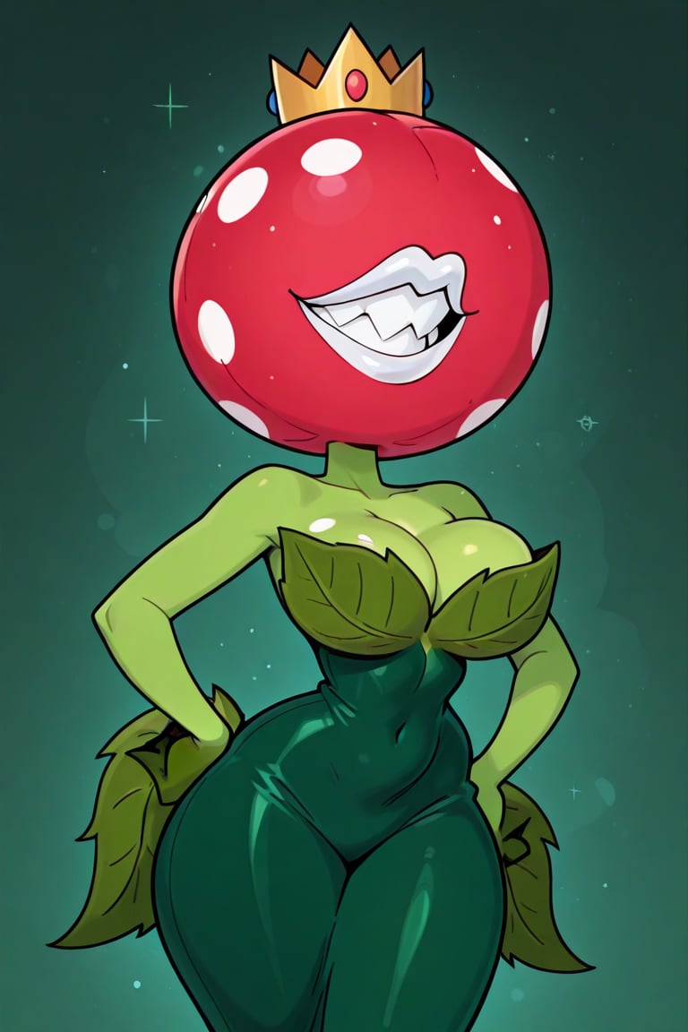 CrownPirahnna,植物女孩,拟人化,红色 Venus 飞蛾陷阱头部带白色斑点,白色嘴唇,宽大的白色嘴巴配尖牙,曲线玲珑,绿色身体,深绿色树叶状双手,大乳房,乳房上覆盖深绿色叶片,深绿色叶片紧身连衣裙,公主桃色王冠,