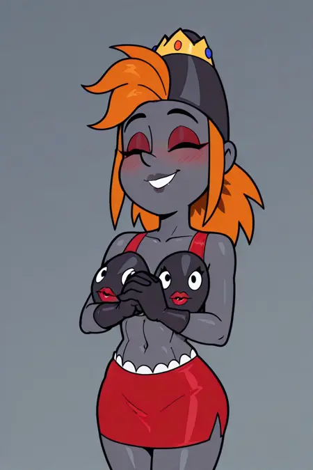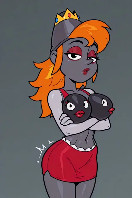 마리오 총알, 총알 빌, 기징카, 반 로켓형 인간, 어두운 회색 피부, 복근, 중간 길이의 검정과 주황색 머리, 어두운 회색 헬멧, 프린세스 피치 왕관, 어두운 빨강 아이섀도우, 곡선형 몸매, 빨간 스트랩이 달린 총알 빌 브라, 밝은 회색 팔, 빨간 치마 같은 요소, 다리로 로켓