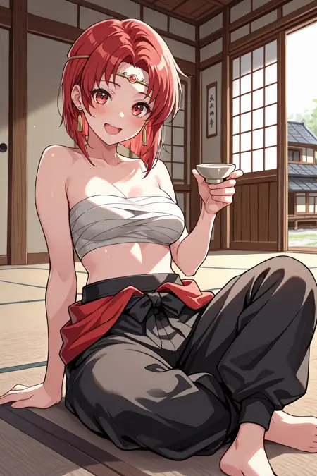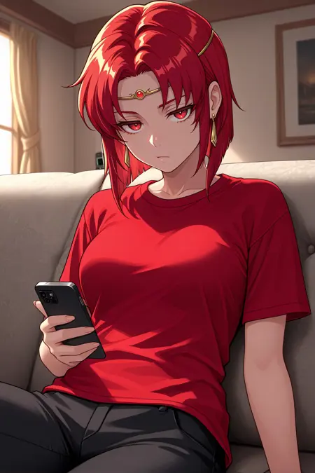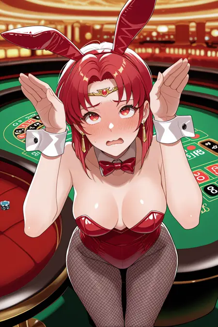 그녀의 전형적인 외모를 위해 "금색 환관, 귀걸이, 빨간 갑옷, 어깨 갑옷, 갑옷 드레스, 팔꿈치 장갑, 연보라색 장갑, 갈색 벨트, 연보라색 치마, 미니스커트, 빨간 부츠, 허벅지 부츠"를 추가하세요.