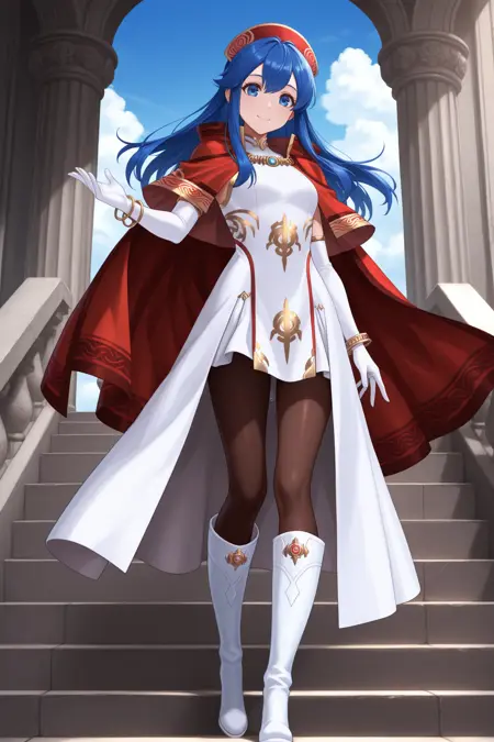 Add "lgll, blue hair, long hair, blue eyes, red hat, red cape, gold trim, white coat, white tabard, white gloves, elbow gloves, gold bracelet, black pantyhose, white boots, knee boots" for Legendary Lilina.