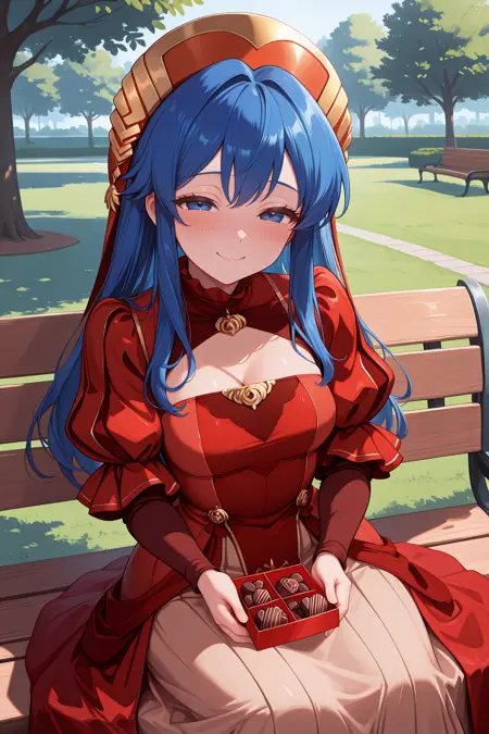 Add "valll, blue hair, long hair, blue eyes, gold hat, red gown, long sleeves, puffy sleeves, cleavage cutout, beige skirt, long skirt" for Valentine's Lilina.