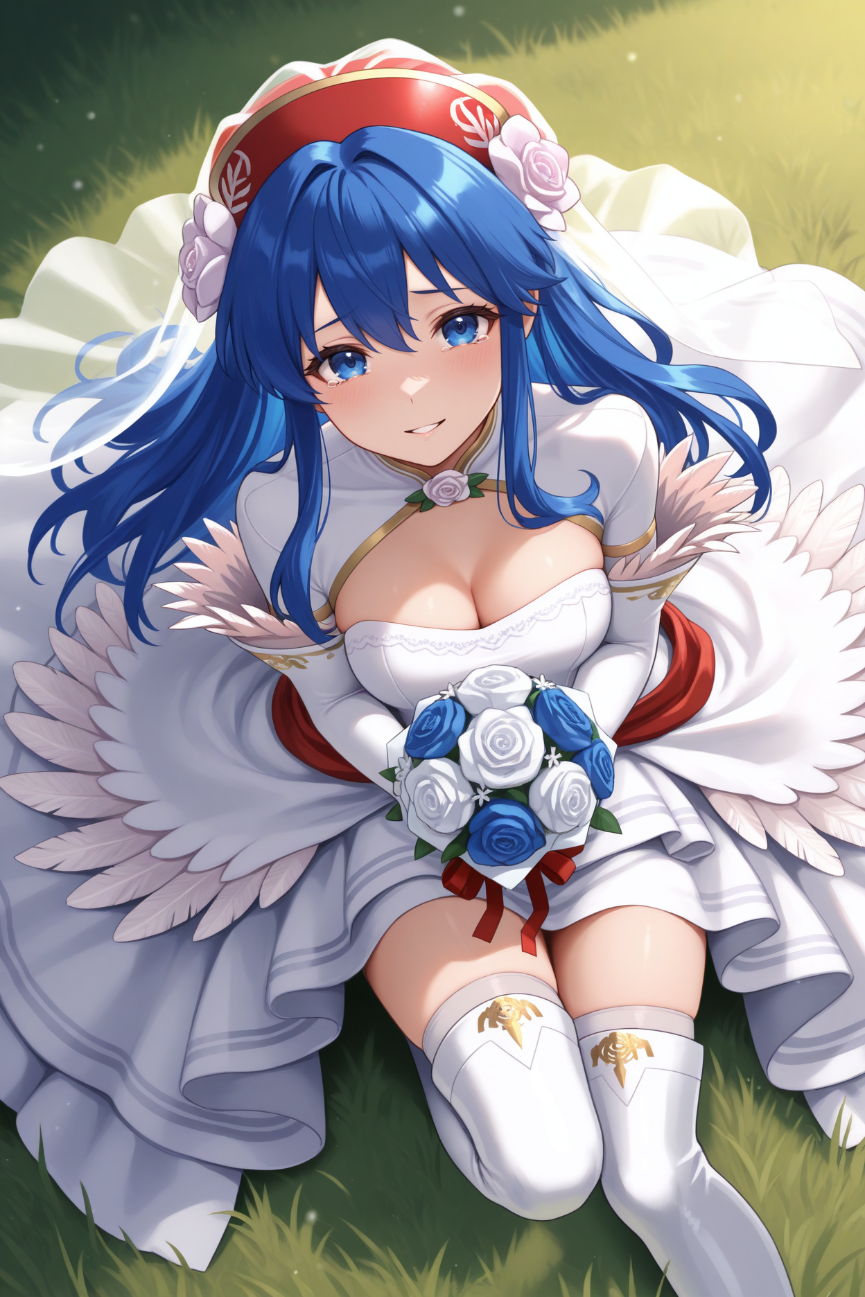 Add "br1dll, blue hair, long hair, blue eyes, red hat, hair flower, bridal veil, white shrug top, wedding dress, white dress, cleavage, feather trim, red sash, detached sleeves, elbow gloves, white gloves, white thighhighs, thigh boots" for Bridal Lilina.