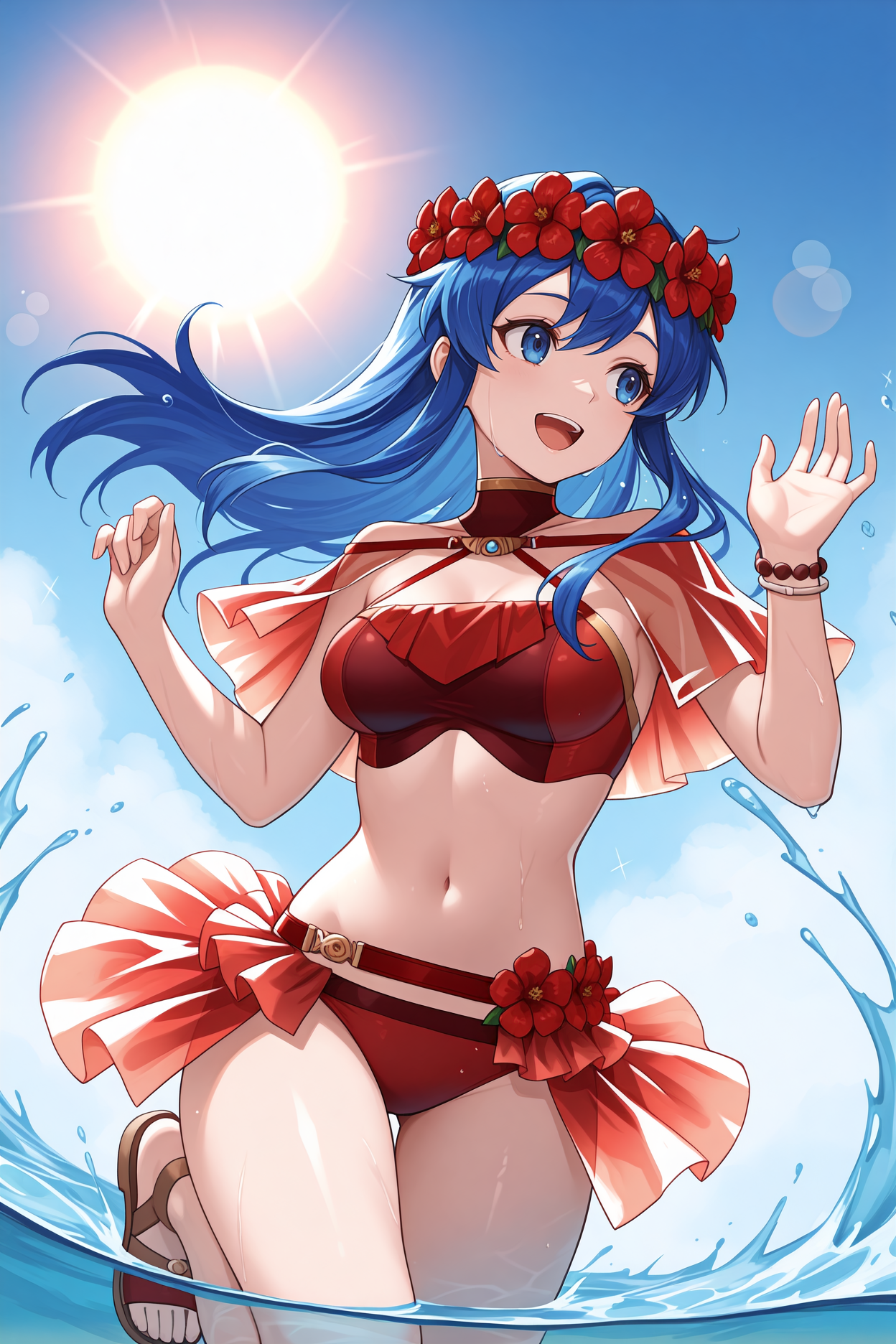 Add "sumll, blue hair, long hair, blue eyes, head wreath, red flower, hair flower, detached collar, red bikini, red straps, see-through capelet, red belt, see-through showgirl skirt, bracelet, sandals" for Summer Lilina.