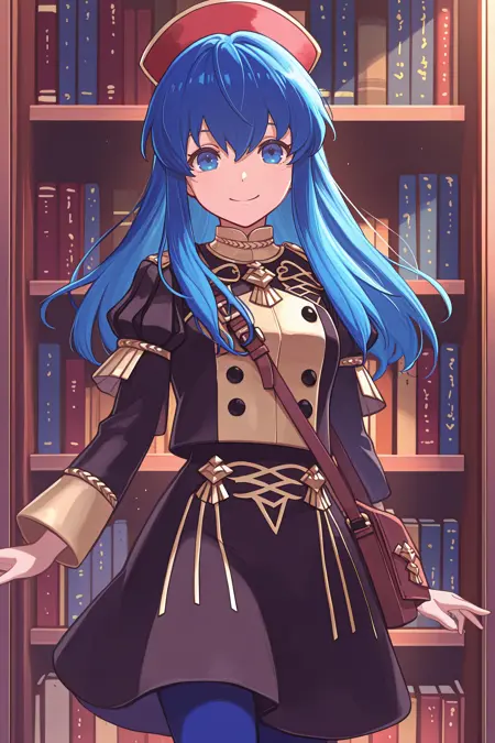 Add "defll, blue hair, long hair, blue eyes, red hat, red capelet, red dress, short dress, white skirt, single glove, red glove, fingerless glove, bracelet, black pantyhose, brown boots" for her regular appearance. (Add "shoulder cutout, aqua belt" for the shoulder cutouts/belt from her FEH redesign.)