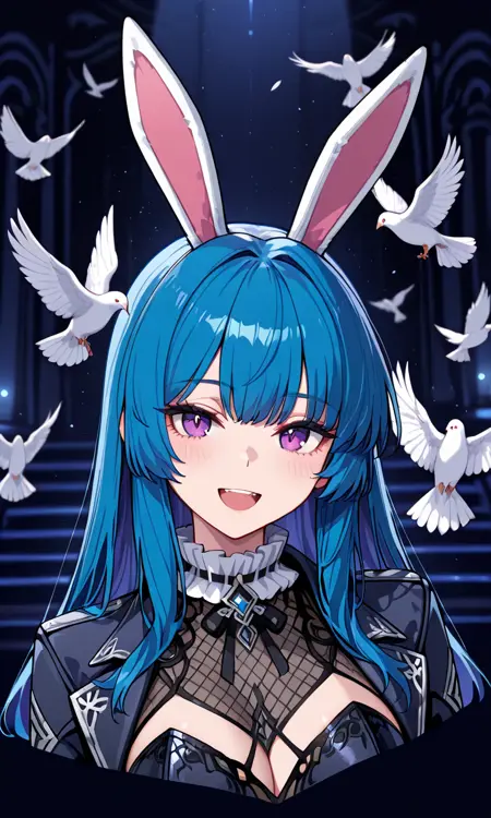 white bunny ears, gradient blue hair, long hair, purple eyes,