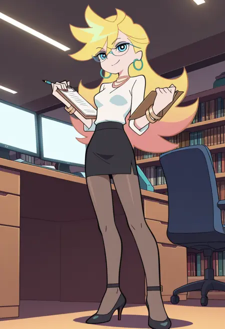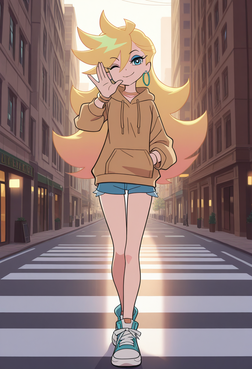anarchy panty,1girl,official style,solo,blue eyes,blonde hair,long hair,jewelry,hoop earrings,bracelet
