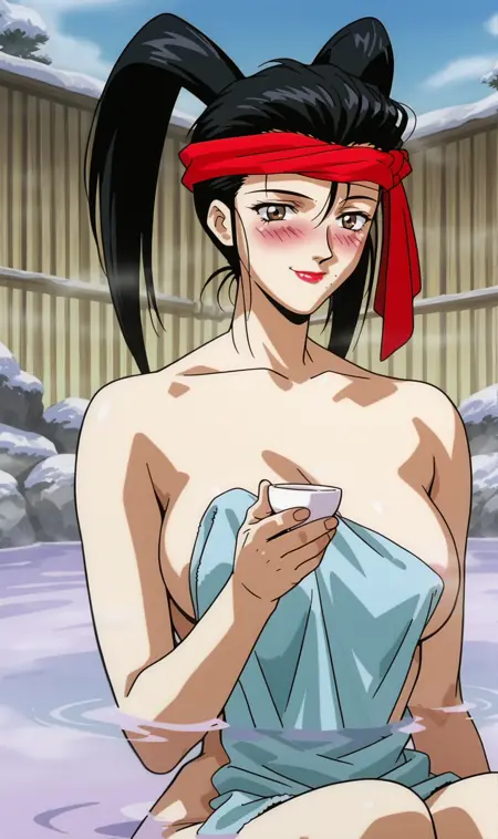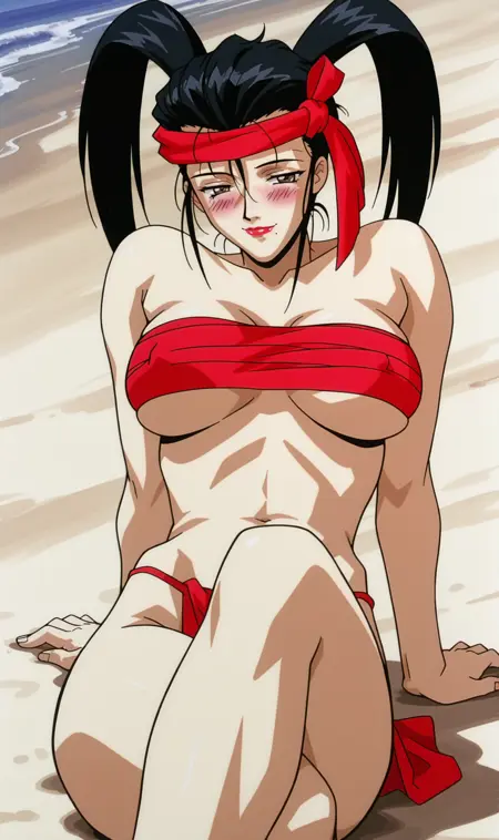 복장 2- '더블테일, 뒤로 빗긴 머리, 빨간 머리띠, 빨간 사라시, 빨간 요복, 언더부브'