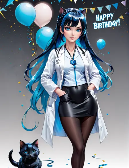 Default Outfit: labcoat, shirt, shirt tucked in, single vertical stripe, black skirt, pencil skirt, pantyhose, necklace, belt