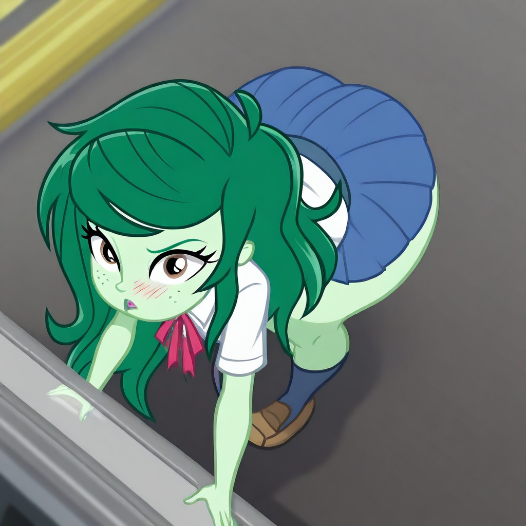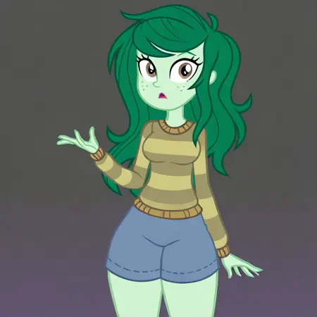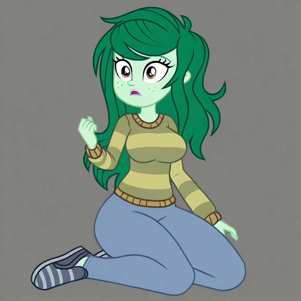 <lora: MLP: Equestria Girls - Wallflower Blush:1>, Equestria Girls, Wallflower Blush, 녹색 피부, 긴 청록색 머리, 두더지, 얼굴의 갈색 두더지, 다채로운 피부, 줄무늬 스웨터, 청바지, 회색 슬립온 신발, 캐주얼 복장, 하스브로 스타일, Equestria Girls 스타일, MLP 애니메이션 정확한 스타일, 만화, 평면 색상, 단순한 만화 음영, 평면 음영, 두꺼운 검은 윤곽선, 벡터 스타일 음영, 커다란 표현력 풍부한 눈,