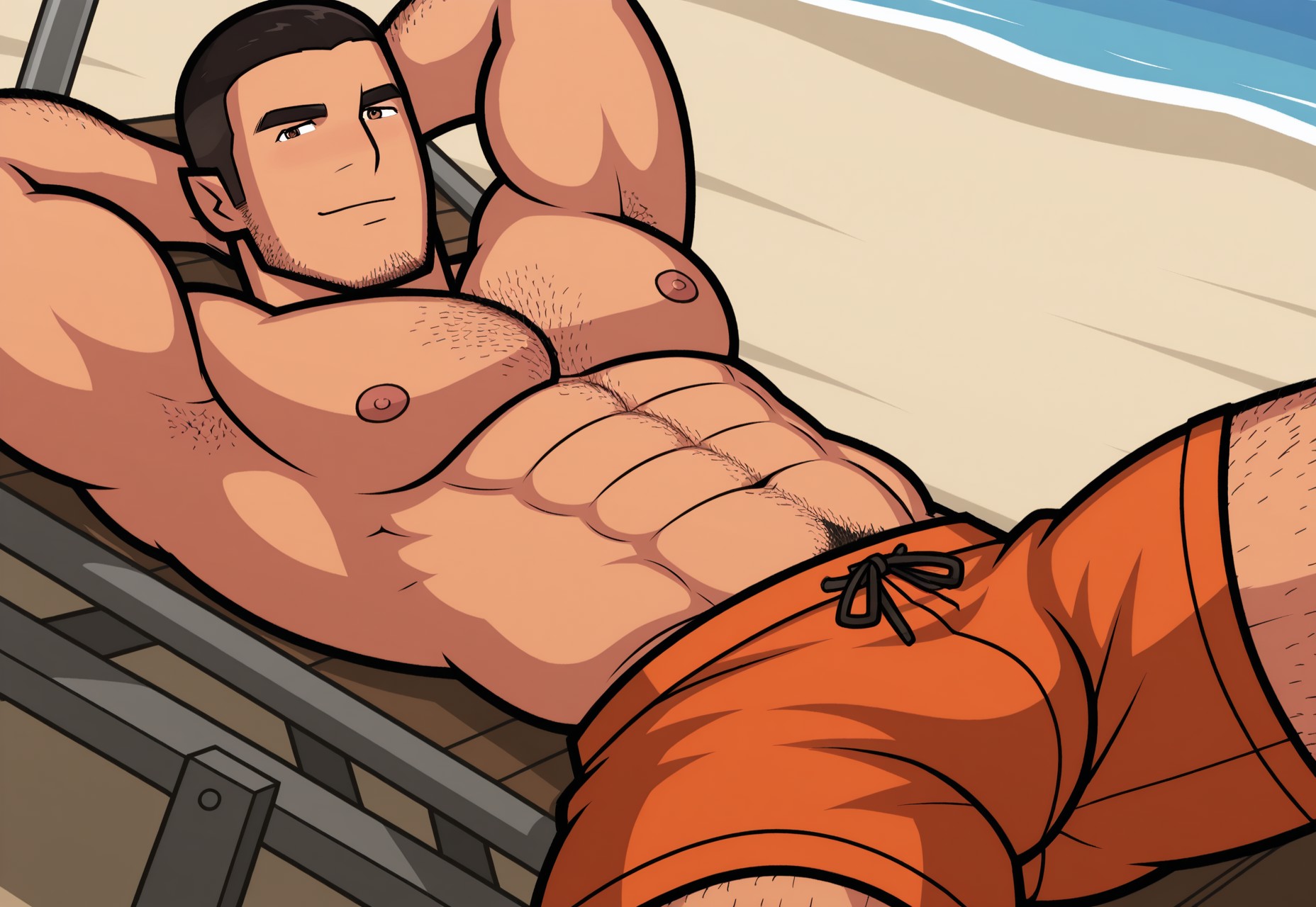 호박색 눈, 두꺼운 눈썹, 측면 수염, 검은 머리카락, 뒤로 빗어넘긴 머리, 평평한 머리, 안면 털, 턱 수염, 가슴 털, 팔 털,