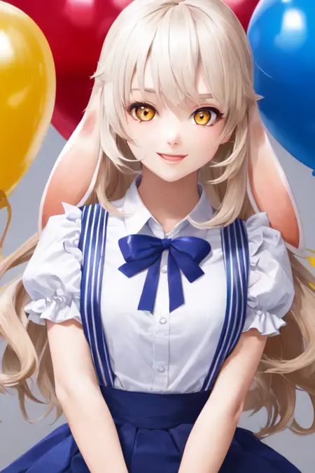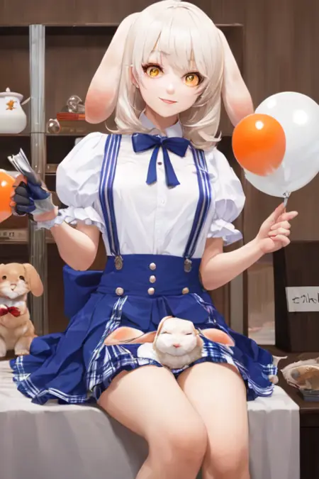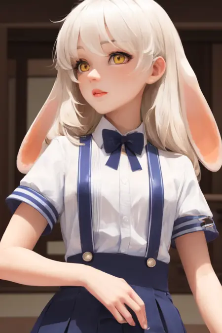 おすすめのプロンプト: 長い白い髪、黄色い目、ふわふわのウサギの耳、白いシャツ、ショートスリーブ、青色のセーターのプリーツスカート、サスペンダー付きスカート、