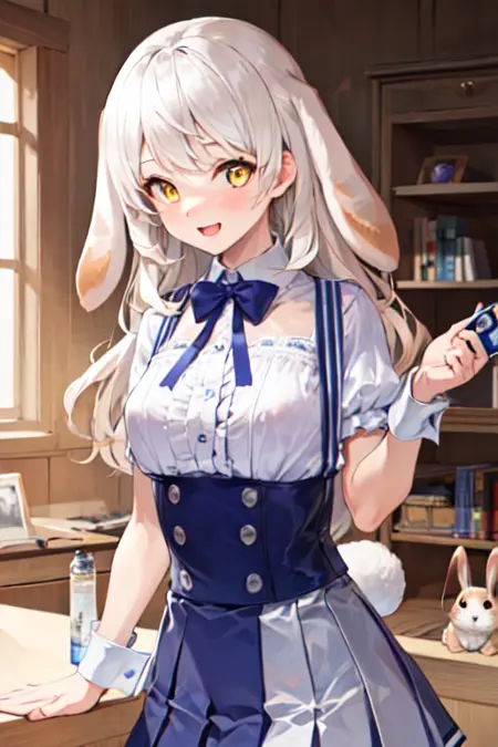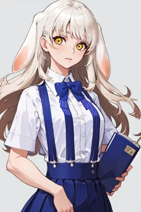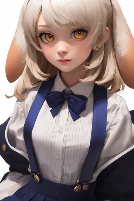 推荐提示:长长的白色头发,黄色眼睛,下垂的兔子耳朵,白色衬衫,短袖,蓝色短百褶裙,背带裙,