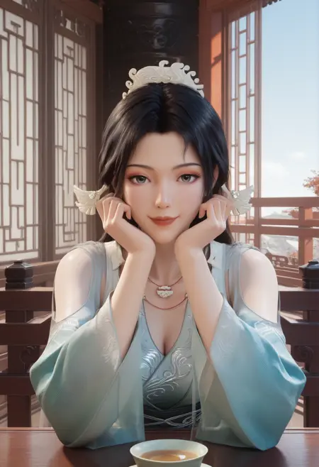 songyu、黒髪、長い髪、髪飾り、化粧、アイライナー、赤い唇、