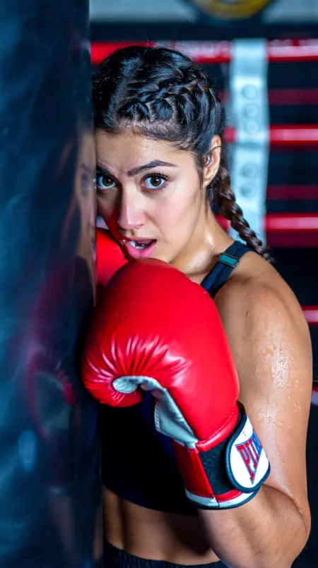1nst4p1c Brazilian morena woman with long black hair tied in a ponytail, wearing a red sports bra and tight gray leggings, posing for a mirror selfie inside a modern gym. She holds her phone slightly tilted in one hand while flexing her waist, lips slightly parted in a playful smirk. Her tanned skin shows natural highlights under the bright overhead gym lights, with subtle sweat detail across her arms. The background shows blurred dumbbells and cardio equipment. The lighting is harsh but realistic, emphasizing her body definition. The overall aesthetic is fitness influencer style, sensual and social media ready. The image is well-composed, vertical framing, with shallow depth of field focusing on her reflection while the gym remains softly visible.