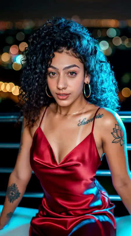 1nst4p1c Latina woman with long dark wavy hair, wearing a neon pink crop top and ripped denim shorts with glitter details, posing confidently on a rooftop terrace at night. She rests one hand on her hip while holding a plastic cup with the other, her expression bold and playful. Her bronzed skin glows naturally under purple and red neon party lights, showing realistic texture. The background shows blurred silhouettes of people dancing and the distant city skyline. The lighting is vibrant and cinematic. The overall aesthetic is urban, sensual, and social media ready. The image is well-composed, vertical framing, with shallow depth of field isolating her while the rooftop atmosphere fades softly.