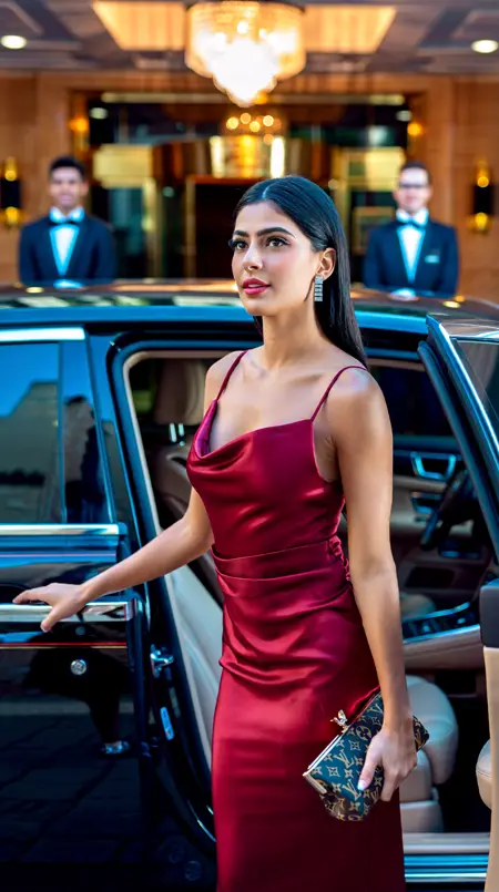1nst4p1c Woman with long straight blonde hair, wearing a short black sequin dress and high heels, stepping out of a black Lamborghini parked in front of a luxury hotel entrance at night. She holds a small designer clutch in her hand, her expression neutral but confident. Her fair skin reflects the golden hotel lights with natural highlights. The background shows blurred chandeliers and hotel staff near the glass doors. The lighting is warm and cinematic, mixing neon reflections from the car with golden tones. The overall aesthetic is glamorous, sensual, and Instagram luxury style. The image is well-composed, vertical framing, with both the woman and the Lamborghini sharply in focus while the background remains softly blurred.