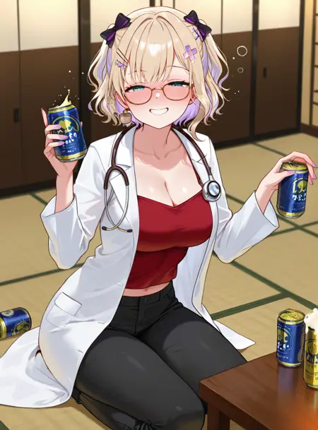 stethoscope on shoulders, open labcoat, red camisole, pants,