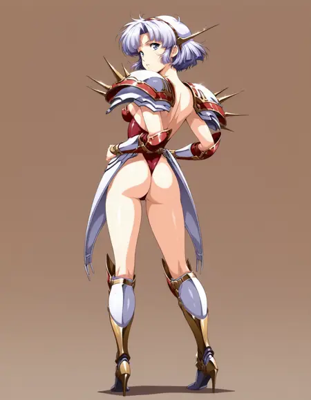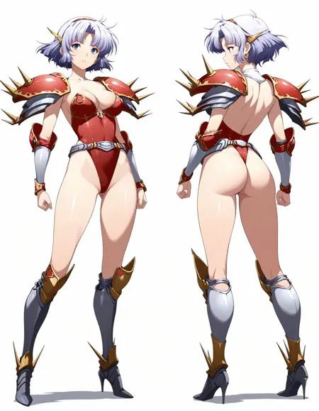 sherry_(langrisser),short_hair,white_hair,blue_eyes,medium_breasts,hairband,armor,shoulder_pads,spikes,red_leotard,thong_leotard,high_heel_boots,armored_boots