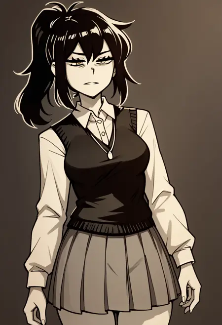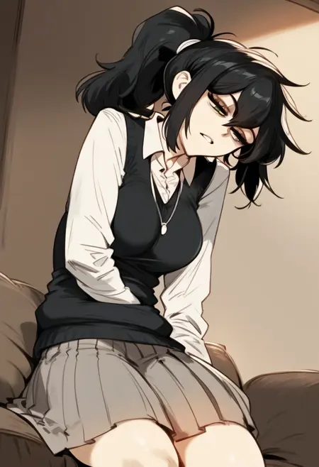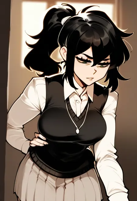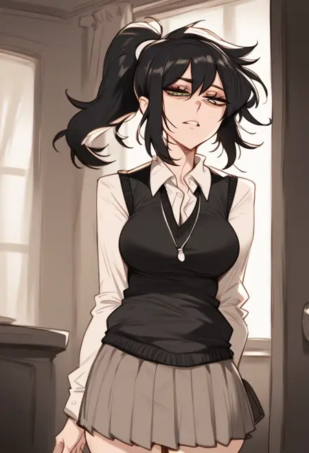 reneegraves, black hair, ponytail, collared shirt, bags under eyes, long sleeves, vest, pleated skirt