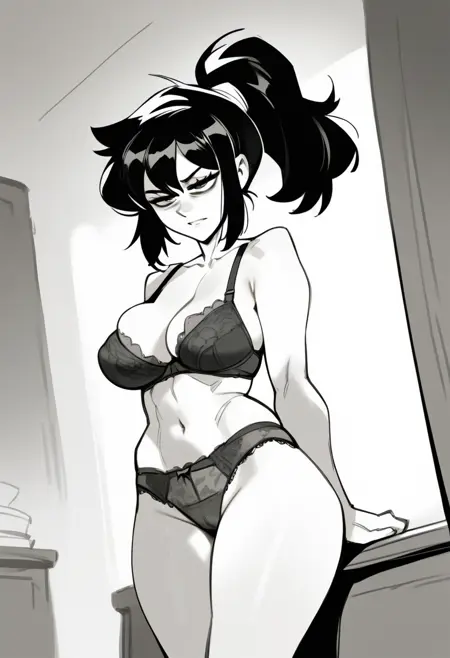 触发词:reneegraves,黑发,马尾辫,有领衬衫,眼下有黑眼圈,长袖,背心,百褶裙