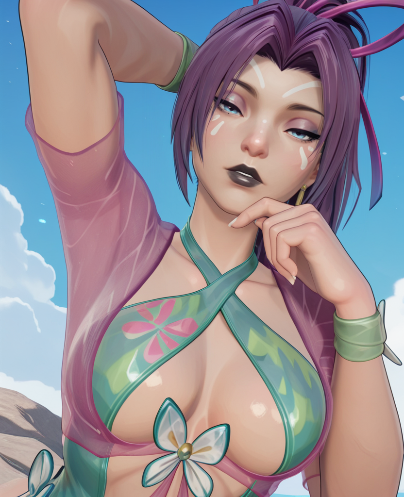psybik1, one-piece swimsuit, front-tie top, translucent clothing, see-through clothes, halterneck, ponytail, hair ribbon, long hair, blue eyes, purple hair, facial mark, black lips, bracelet,thigh strap, sandals