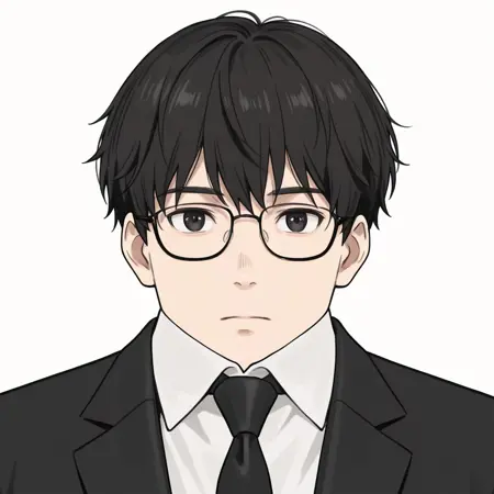 solo, 1boy, glasses, portrait, short hair, 1x1pic_meme, no neck, necktie, black suit, facing front, looking at the viewer, white background, masterpiece, 4k resolution