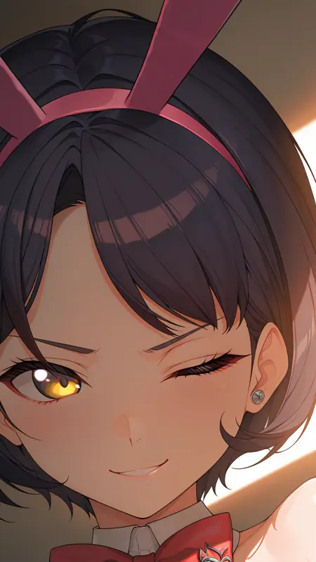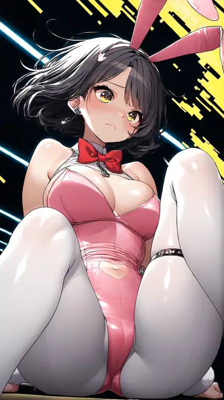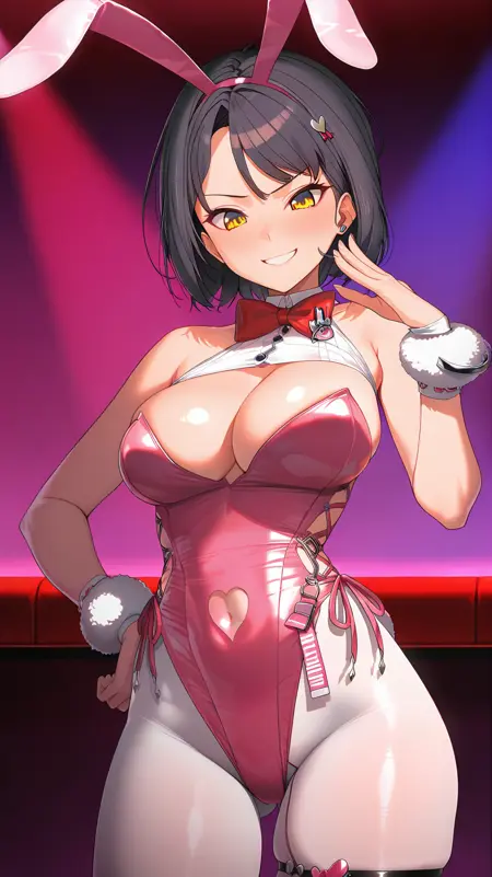 例のプロンプト: 1girl, breasts, short hair, large breasts, black hair, yellow eyes, bow, bunny ears, cleavage, pantyhose, white pantyhose, pink leotard, bowtie, rabbit ears, red bow, leotard, wrist cuffs, clothing cutout, strapless, thigh strap, detached collar, playboy bunny, red bowtie, strapless leotard, navel