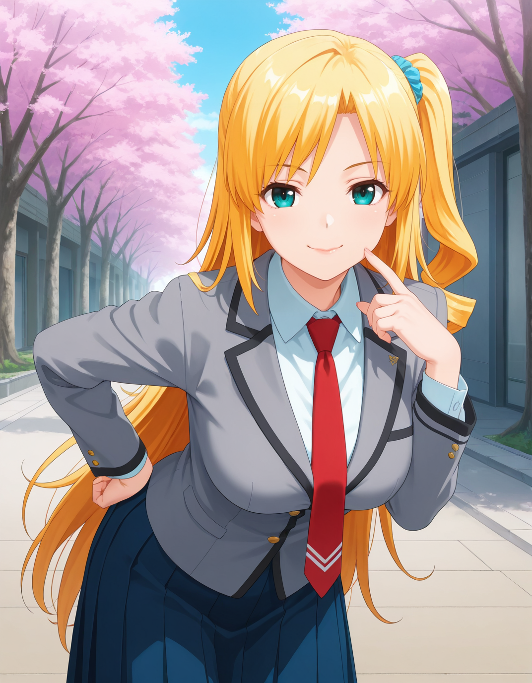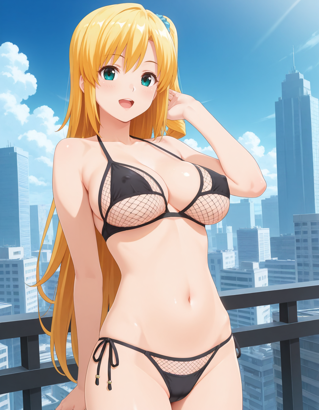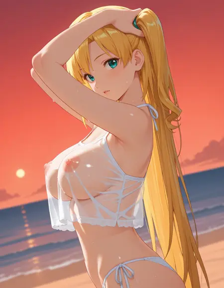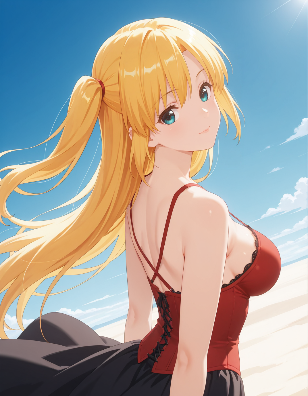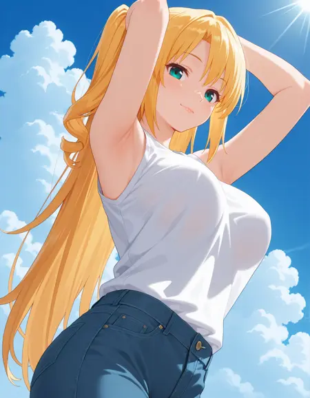 基本のトリガーワード:金髪、非常に長いストレートヘア、サイドポニーテール、濃いターコイズ色の目、細い唇、大きな自然な胸