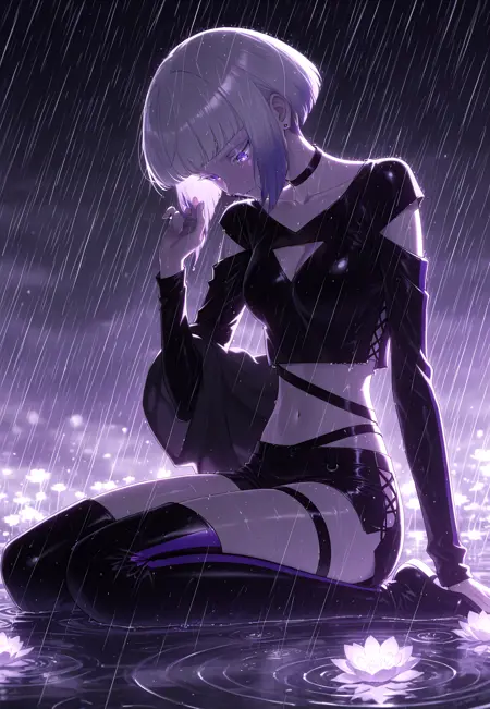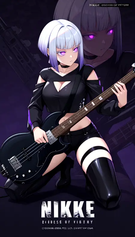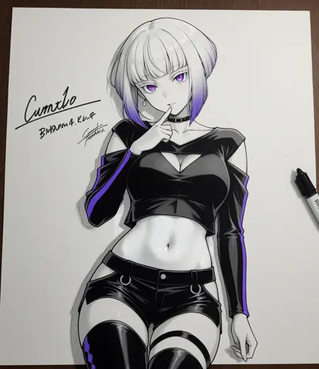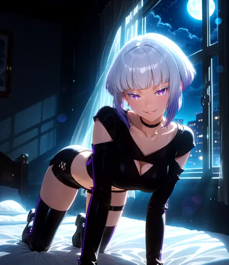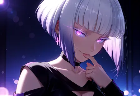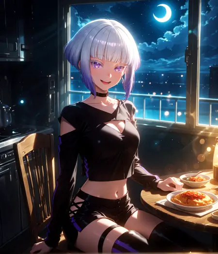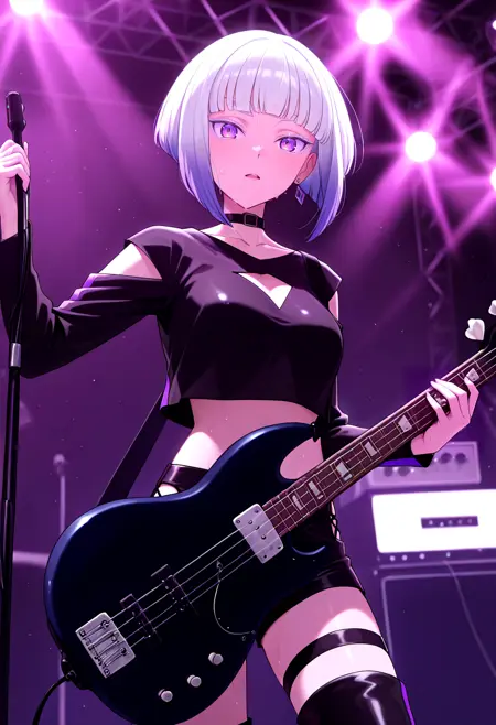 Tamikonz, purple eyes, white eyelashes, colored eyelashes, bob cut, short hair, blunt bangs, multicolored hair, silver hair, purple hair, gradient hair, medium breasts, collarbone, long sleeves, black crop top, black choker, shoulder cutout, single vertical stripe, cleavage cutout, midriff, harness:1.6, thigh strap, navel, waist strap, hip vent, black shorts, black thigh boots, earrings