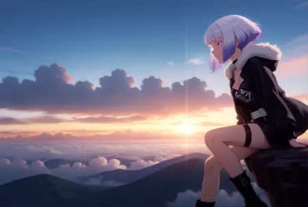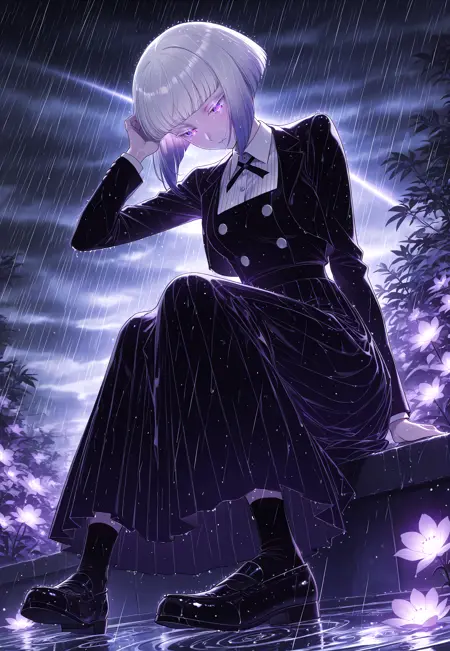 Tamischool, purple eyes, eye reflection, white eyelashes, colored eyelashes, bob cut, short hair, blunt bangs, multicolored hair, silver hair, purple hair, gradient hair, medium breasts, black neck ribbon, buttons, long sleeves, black cropped jacket, white shirt, collared shirt, black pleated skirt, long skirt, black socks, black loafers,