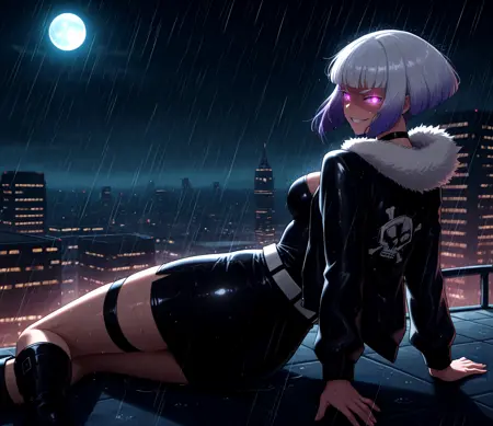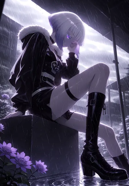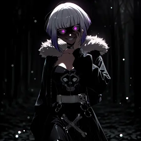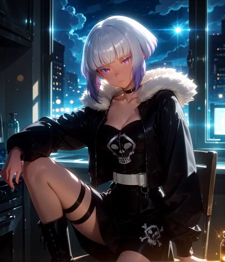 Tamicasual, purple eyes, white eyelashes, colored eyelashes, bob cut, short hair, blunt bangs, multicolored hair, silver hair, purple hair, gradient hair, medium breasts, black choker, fur-trimmed jacket, black jacket, open jacket, long sleeves, black dress, short dress, white belt, skull print, thigh strap, black boots,