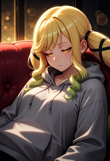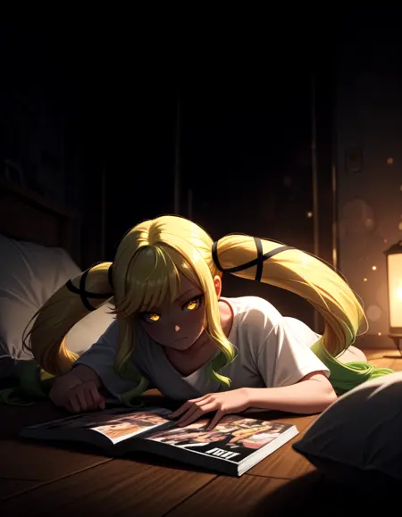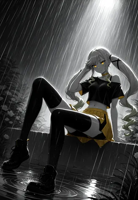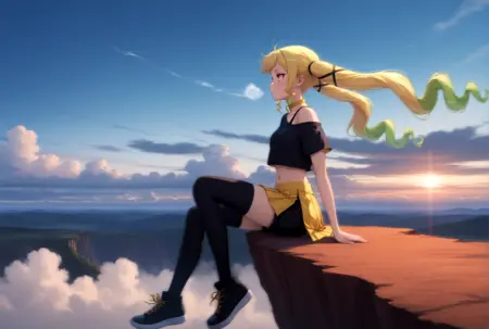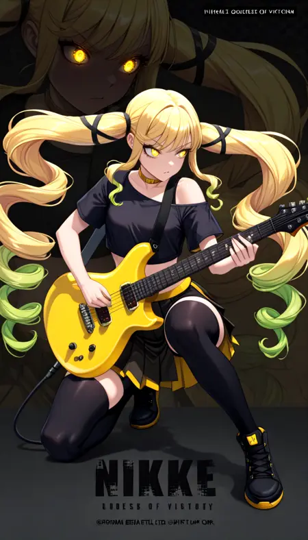 릴리콘츠, 노란 눈, 다색 머리카락, 금발, 녹색 머리카락, 더블 테일, 그라디언트 머리카락, 트윈 드릴, 드릴 헤어, 긴 머리카락, 헤어 리본, 작은 가슴, 노란 목걸이, 어깨 드리핑 셔츠, 검은 셔츠, 브라 스트랩, 복부, 배꼽, 주름 치마, 측면 슬릿, 치마 아래 단축바지, 검은 단축바지, 미니 치마, 검은 허벅지 양말, 검은 스니커즈,
