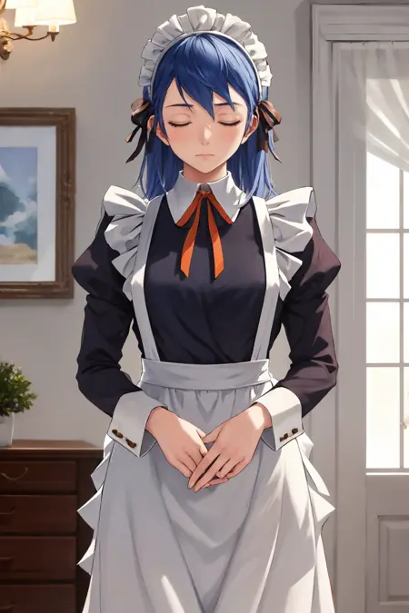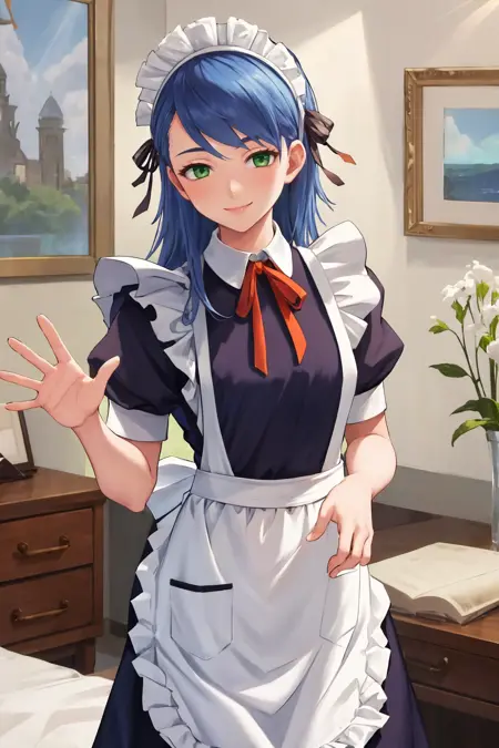 リラ、緑の目、メイド、メイド頭飾り、エプロン、リボン