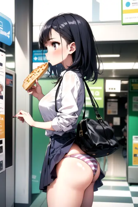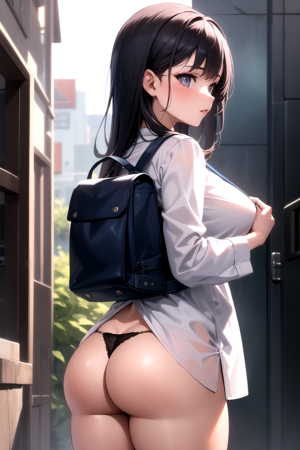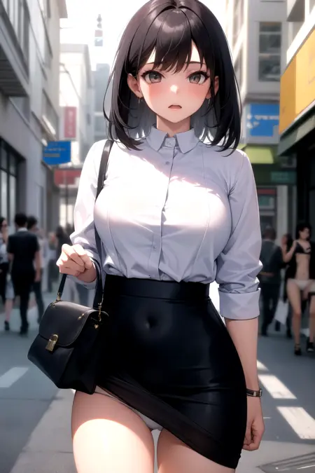 要获得 LoRA 效果,你应包含与裙子相关的标签(例如:skirt、pleated skirt、skirt caught on object)、与内裤相关的标签(例如:pantyshot、white panties),以及与包相关的标签(例如:backpack、handbag、shoulder bag)。从背面视角更容易实现(示例标签:from behind、looking back、ass)。