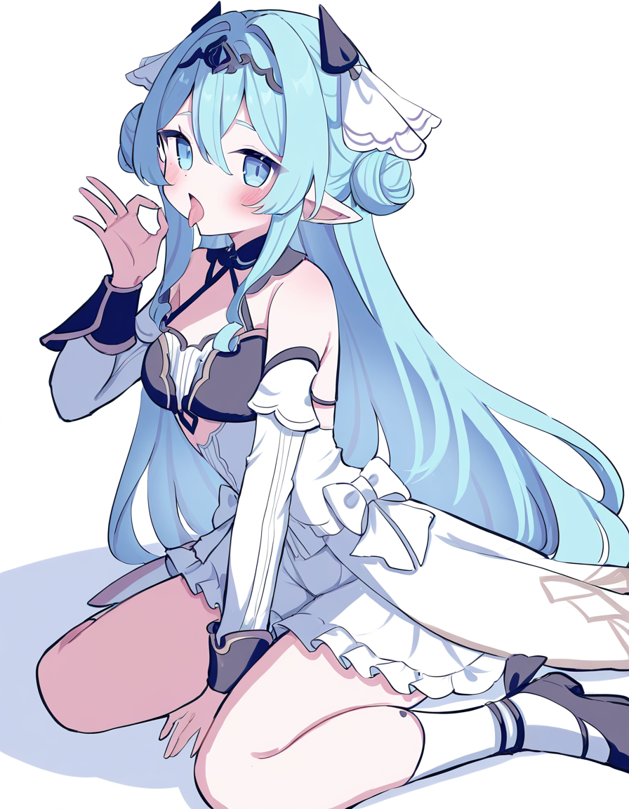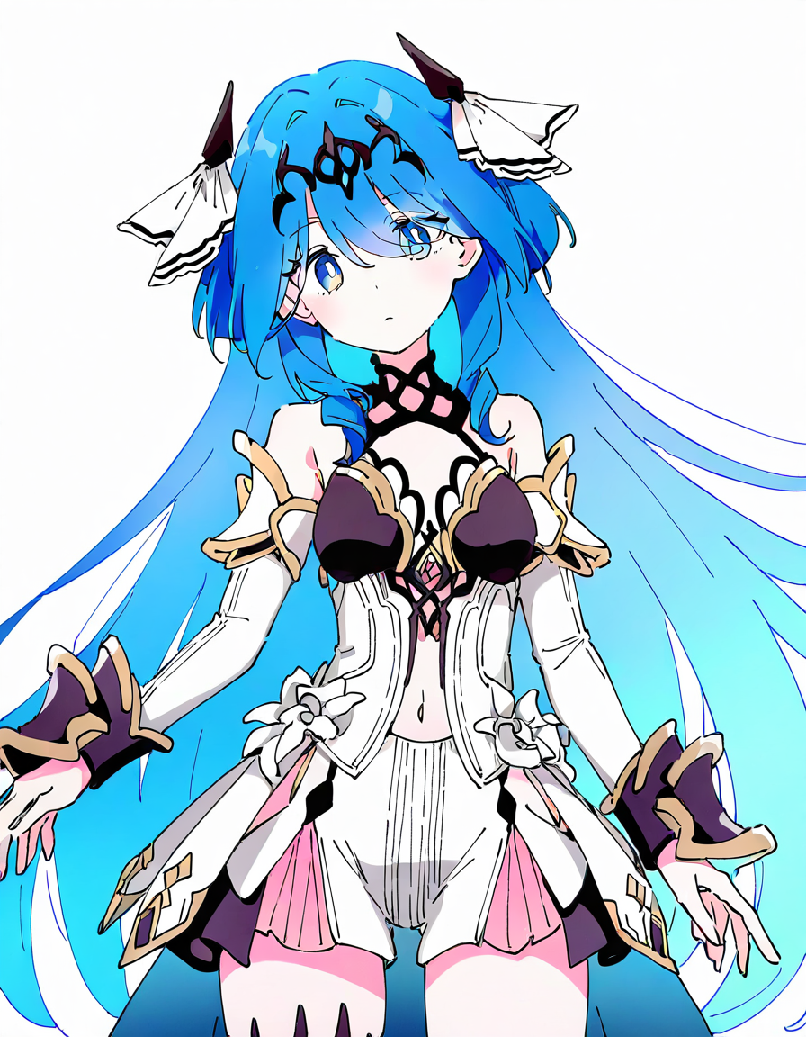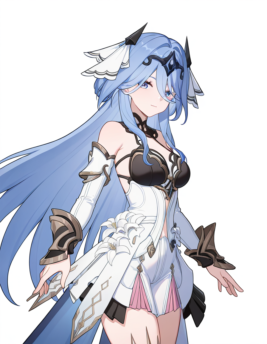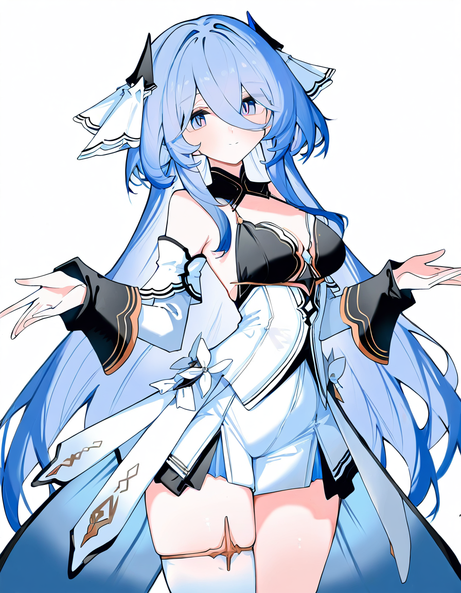 white dress,bare shoulders,detached sleeves,hair ornament,blue hair,