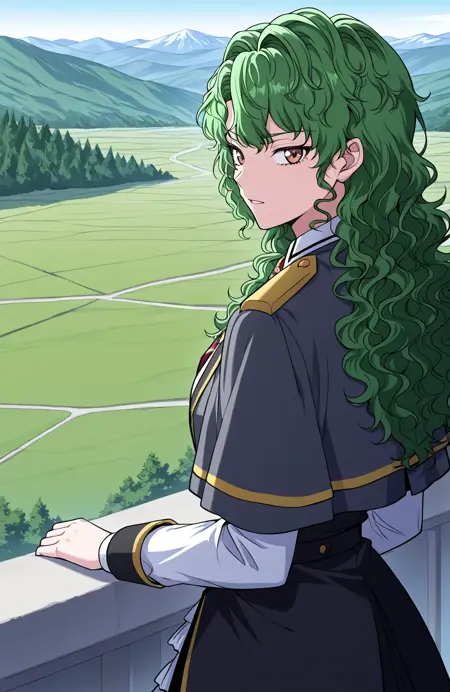 Natasha, 1girl, solo, brown eyes, green hair, long hair, curly hair, thick bangs, hair between eyes, long sidelocks,
