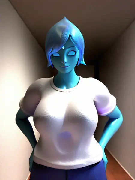 プロンプト: FiSSIl、ショートヘア、無表情、青い目、青い髪、色付き肌、青い肌、額の宝石、宝石、ドレス、タイツ、マント