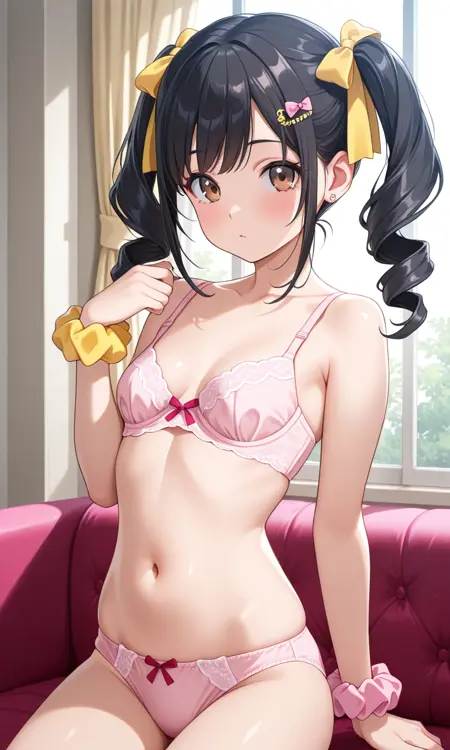 潘子瑜、1人 Girl、シングル、黒髪、髪飾り、茶色い目、胸、ジュエリー、ツインテール、サイドロックス、小胸、髪のリボン、髪リボン、リボン、 bow、ロングヘア、スクランチ、ドリルヘア、ツインドリル、黄色いリボン、手首のスクランチ、
