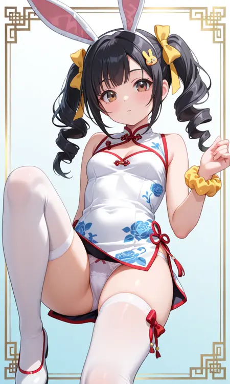 ドレス、太ももハイソックス、動物の耳、下着、パンツ、ノースリーブ、白いドレス、ウサギの耳、白い太ももハイソックス、フェイク動物の耳、短いドレス、パンティショット、肩出し、赤いリボン、衣装カットアウト、中国風衣装、胸元カットアウト、黄色いリボン、靴、白い靴、