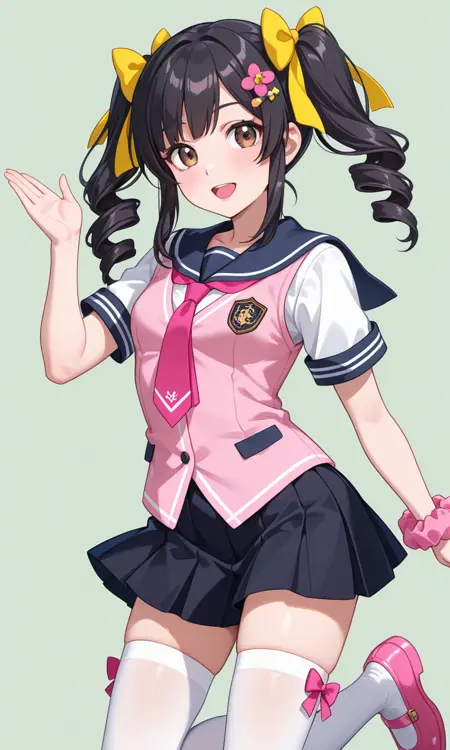 スカート、太ももハイソックス、リボン、制服、短袖、プリーツスカート、フリル、ネクタイ、靴、セラフク、黒いスカート、セーラー服の襟、縞模様の服、ベスト、ピンクのリボン、ピンクのベスト、白い太ももハイソックス、絶対領域、ピンクの靴、