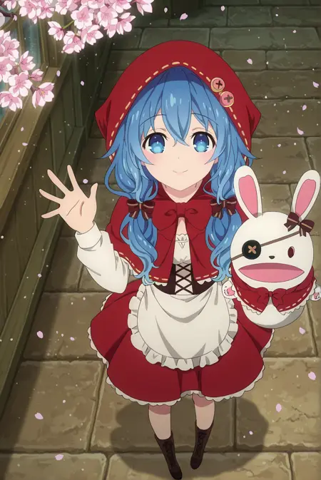 赤ずきん:yoshino, red-rid-hood, 1girl, 青い目, 青い髪, 長髪, 髪飾り, 赤いフード, 赤いカーベレット, 白いシャツ, コルセット, アプロン, 赤いスカート, rrh_手品人形, rrh_ぬいぐるみのうさぎ人形, rrh_人形のアイパッチ, 赤いブーツ