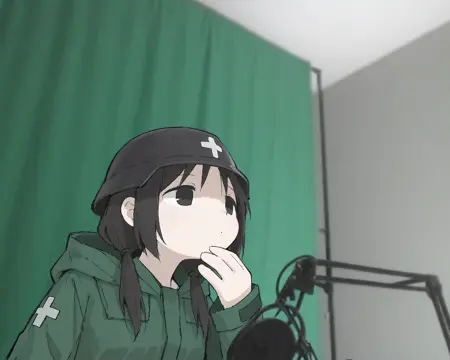 forsencam, solo, upper body, indoors, green curtains, microphone, looking ahead, hand on own chin, microphone stand, thinking