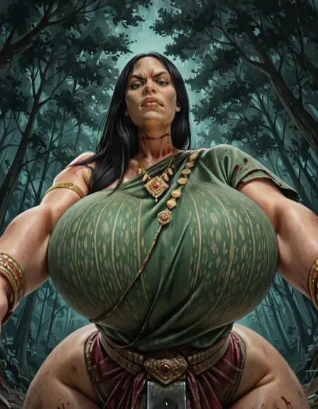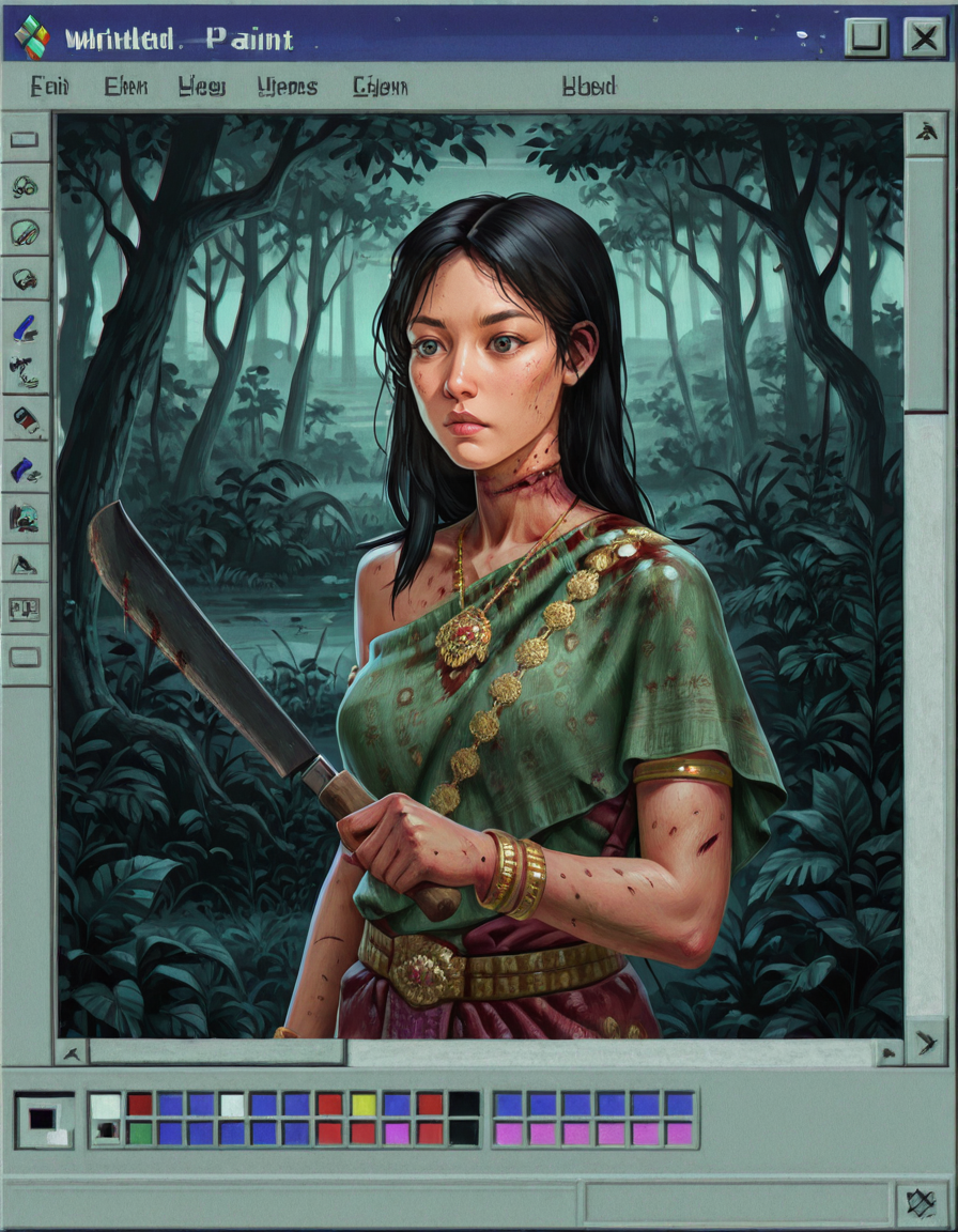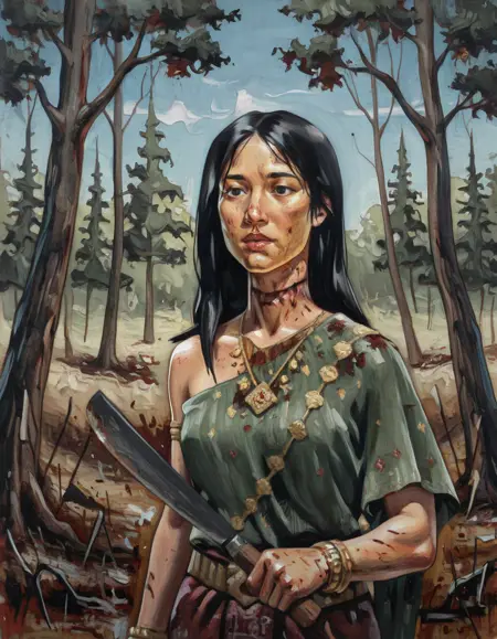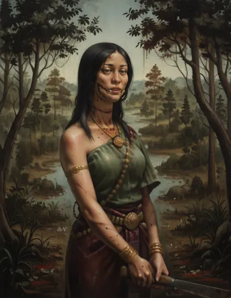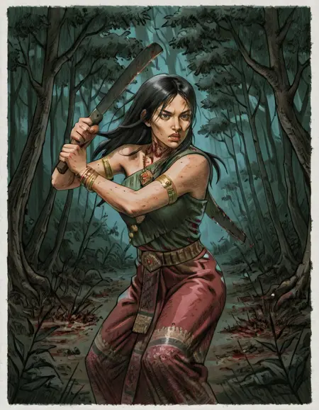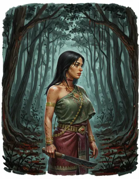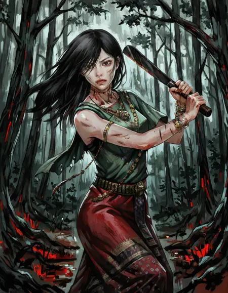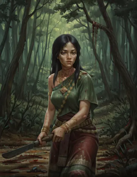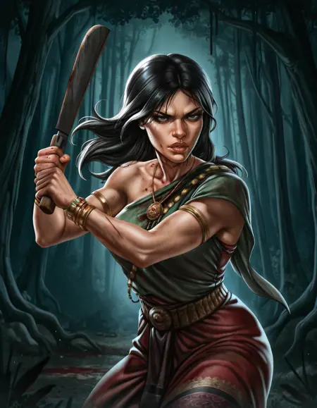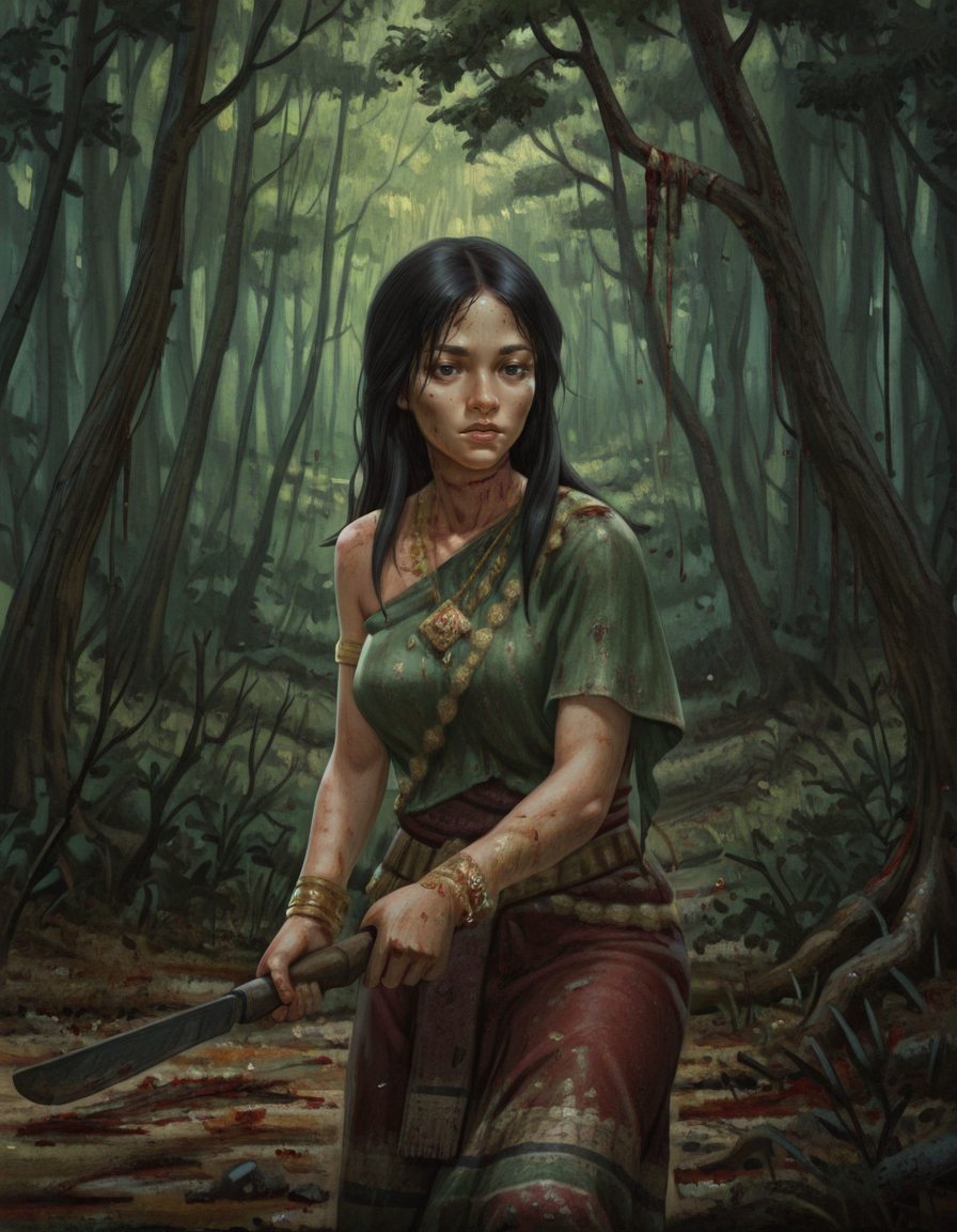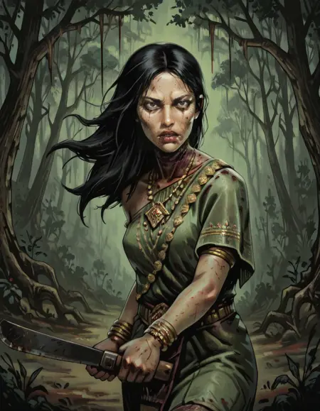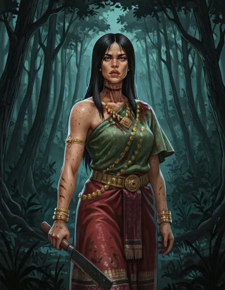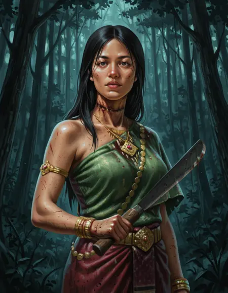 1girl, solo, jewelry, black hair, bracelet, long hair, weapon, armlet, holding, necklace, sandals, bloody neck, wound neck, machete, dress, krasue