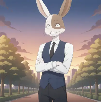 anthro, furry, rabbit, rabbit ears, multi-colored fur, whiskers, black eyes, small beady eyes