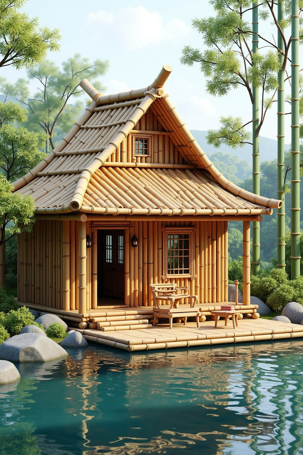 4. 대나무 요소를 포함한 동양 건축 스타일, 강가 오두막을 건설하고, 대나무 벽과 경사진 지붕을 적용하며, 물가에 대나무 뗏목을 배치.
