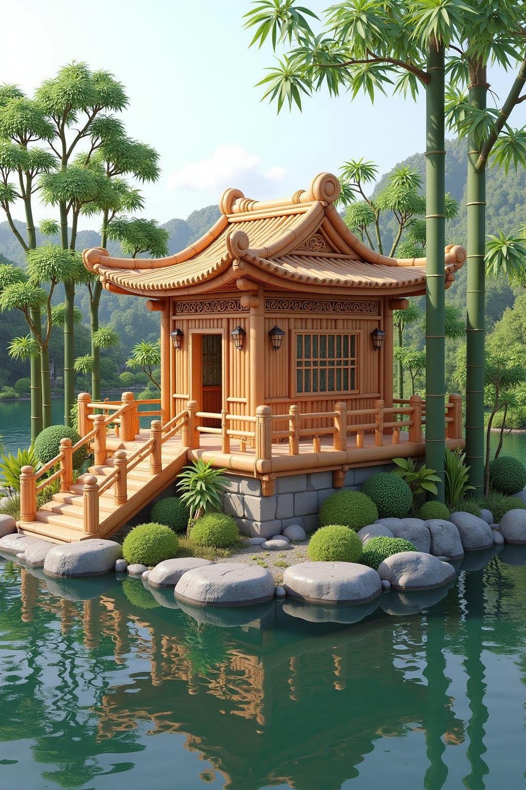 8. 대나무 요소를 포함한 동양 건축 스타일, 호숫가 정자를 설계하고, 대나무 난간과 곡선 지붕을 적용하며, 호수에 대나무 그림자가 반영되도록 표현.
