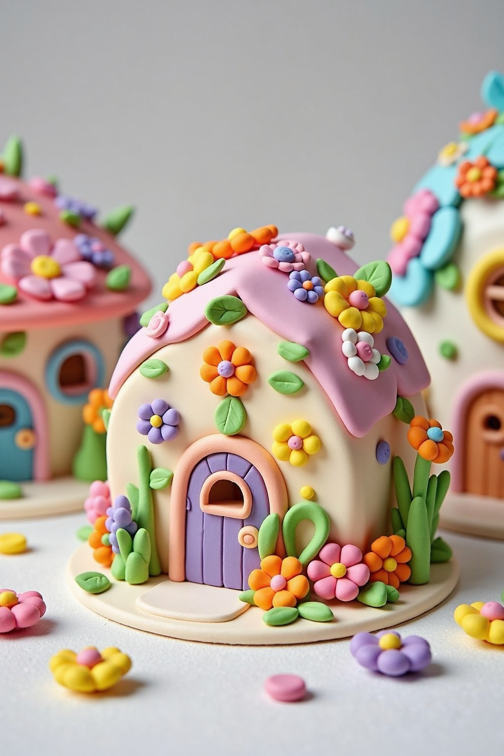 수제 점토 집 모델, 화려한 꽃으로 장식되고, 파스텔톤 벽, 작은 문과 창문이 있으며, 동화 속 정원 풍경에 놓여 있습니다.